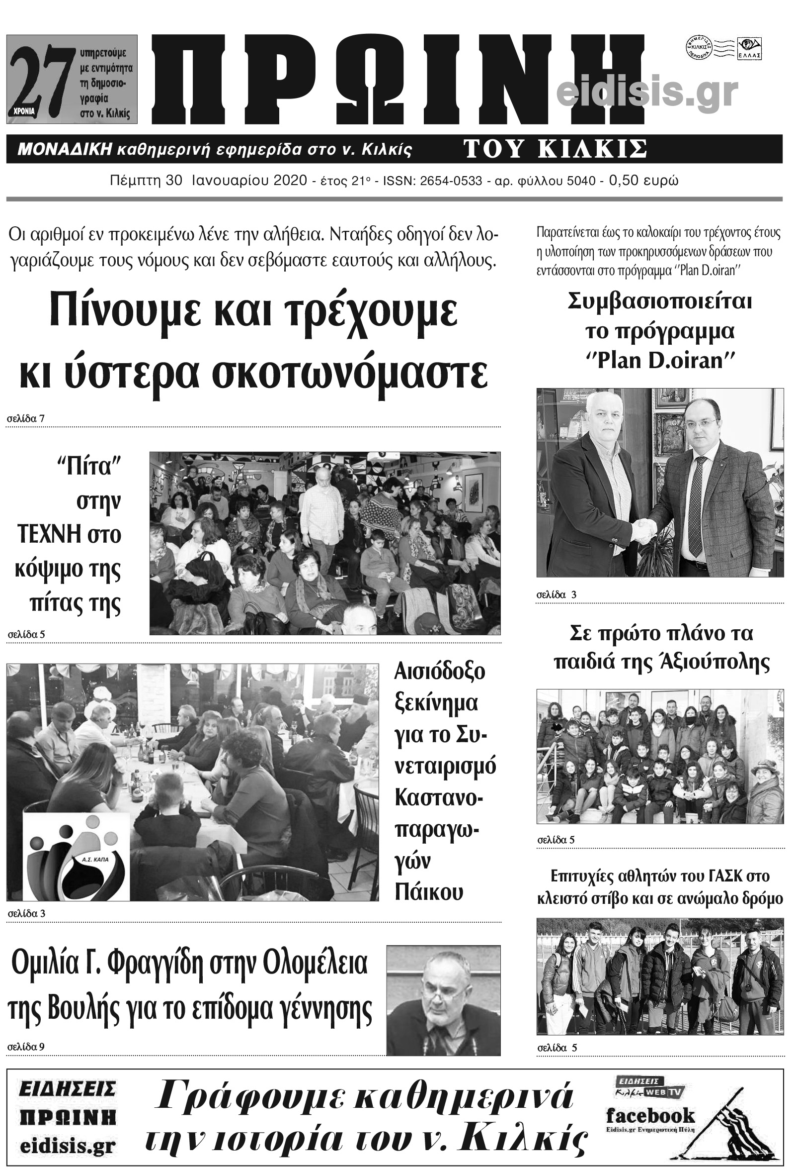 Διαβάστε το νέο πρωτοσέλιδο της Πρωινής του Κιλκίς, μοναδικής καθημερινής εφημερίδας του ν. Κιλκίς (30-1-2020)