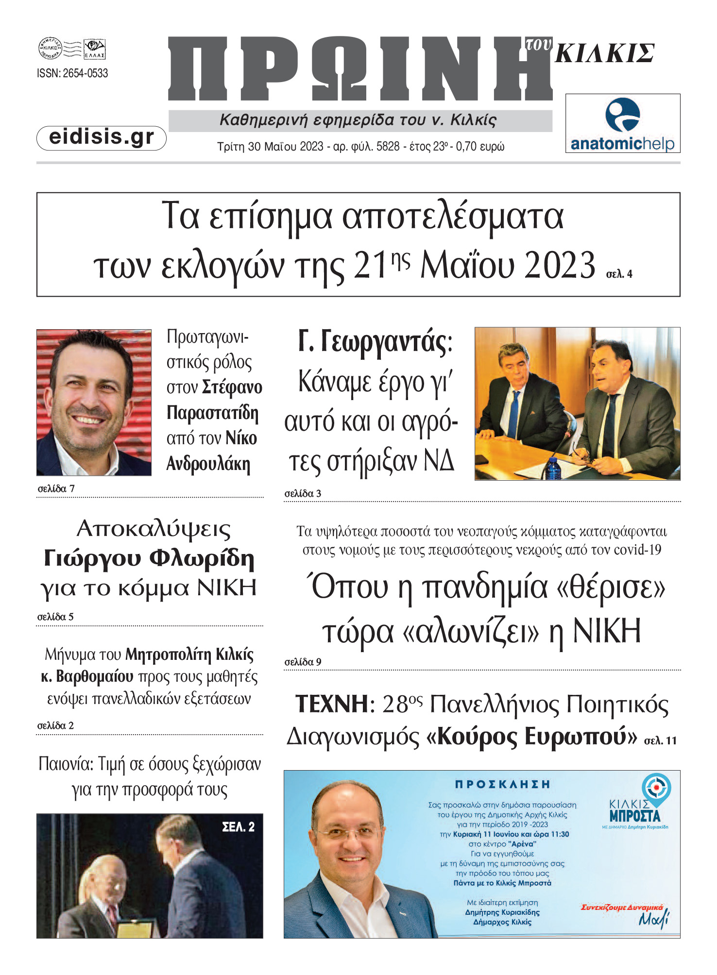 Διαβάστε το νέο πρωτοσέλιδο της Πρωινής του Κιλκίς, μοναδικής καθημερινής εφημερίδας του ν. Κιλκίς (30-5-2023)