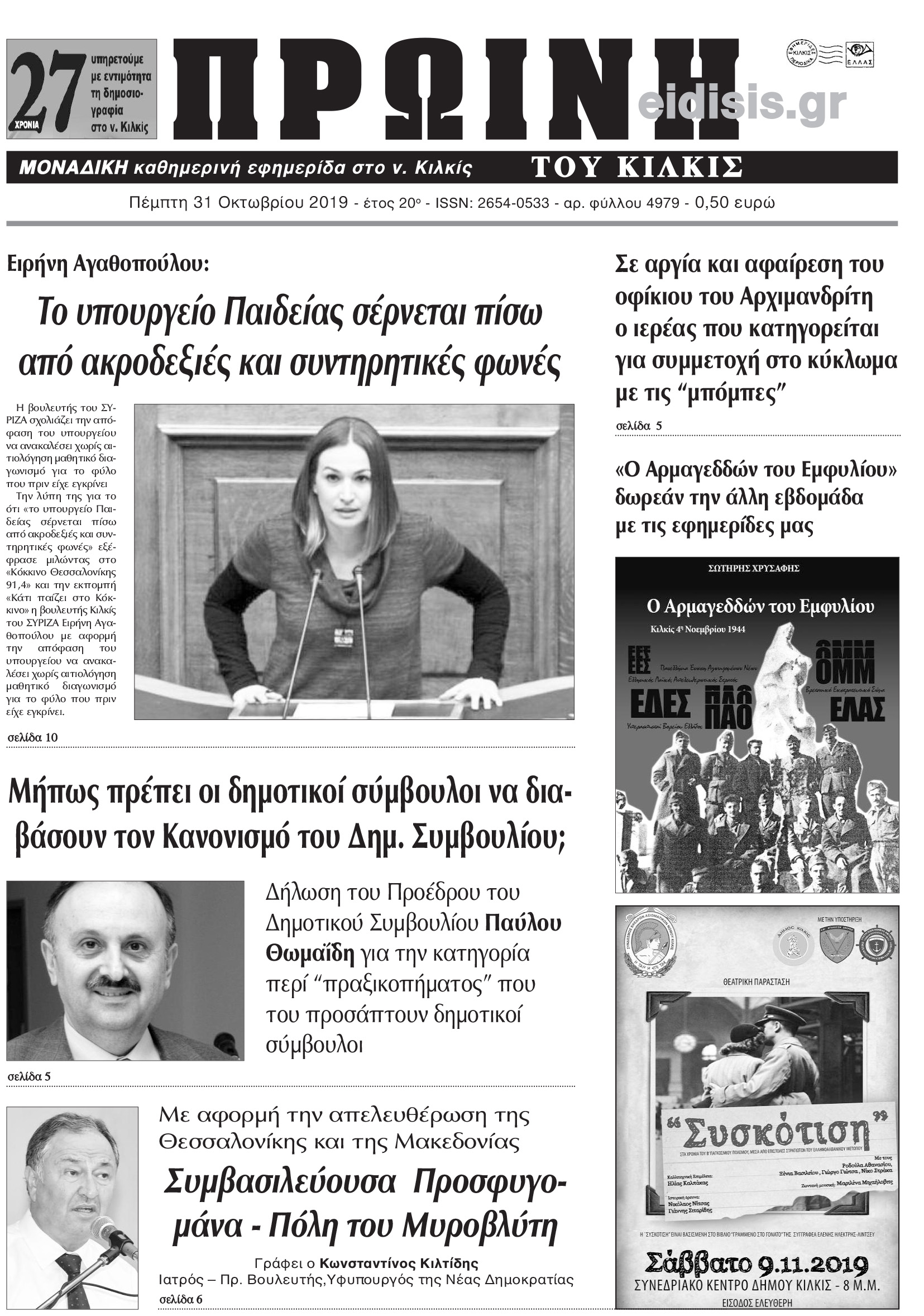 Διαβάστε το νέο πρωτοσέλιδο της Πρωινής του Κιλκίς, μοναδικής καθημερινής εφημερίδας του ν. Κιλκίς (31-10-2019)