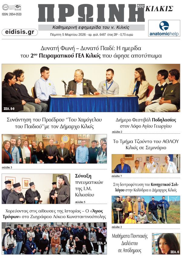Διαβάστε το νέο πρωτοσέλιδο της Πρωινής του Κιλκίς, μοναδικής καθημερινής εφημερίδας του ν. Κιλκίς (5-3-2026)