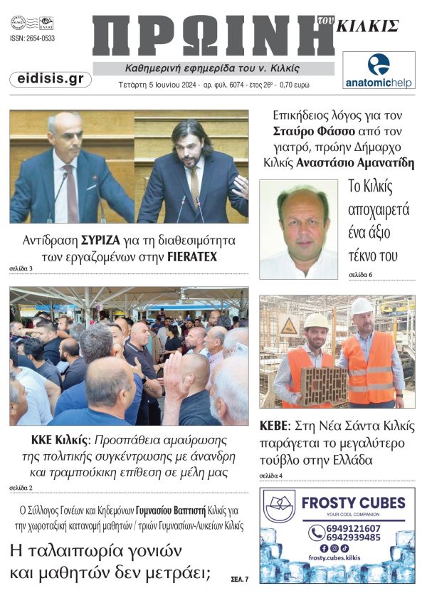 Διαβάστε το νέο πρωτοσέλιδο της Πρωινής του Κιλκίς, μοναδικής καθημερινής εφημερίδας του ν. Κιλκίς (5-6-2024)