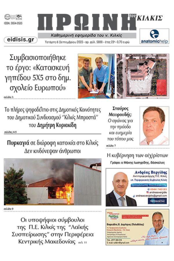 Διαβάστε το νέο πρωτοσέλιδο της Πρωινής του Κιλκίς, μοναδικής καθημερινής εφημερίδας του ν. Κιλκίς (6-9-2023)