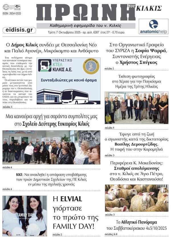 Διαβάστε το νέο πρωτοσέλιδο της Πρωινής του Κιλκίς, μοναδικής καθημερινής εφημερίδας του ν. Κιλκίς (7-10-2025)