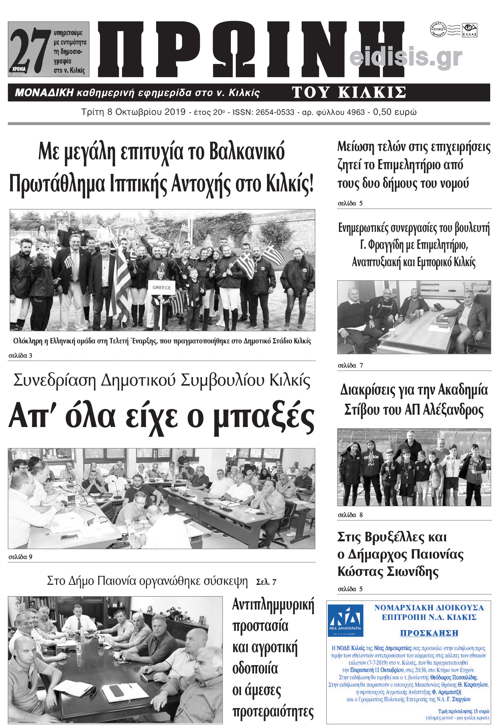 Διαβάστε το νέο πρωτοσέλιδο της Πρωινής του Κιλκίς, μοναδικής καθημερινής εφημερίδας του ν. Κιλκίς (8-10-2019)
