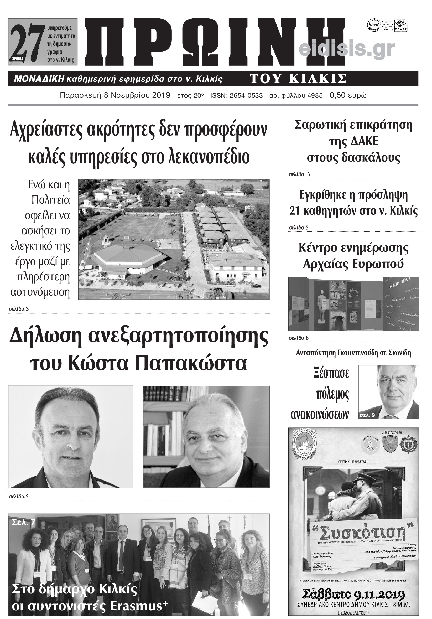 Διαβάστε το νέο πρωτοσέλιδο της Πρωινής του Κιλκίς, μοναδικής καθημερινής εφημερίδας του ν. Κιλκίς (8-11-2019)