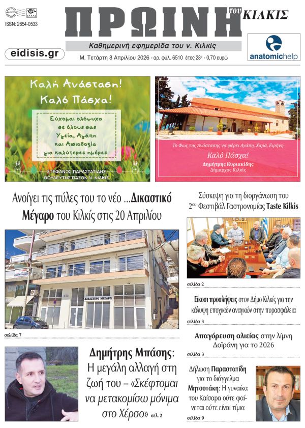 Διαβάστε το νέο πρωτοσέλιδο της Πρωινής του Κιλκίς, μοναδικής καθημερινής εφημερίδας του ν. Κιλκίς (8-4-2026)