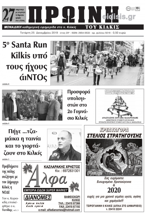 Διαβάστε το νέο πρωτοσέλιδο της ΠΡΩΙΝΗΣ του Κιλκίς, της μοναδικής καθημερινής εφημερίδας του ν. Κιλκίς (25-12-2019)