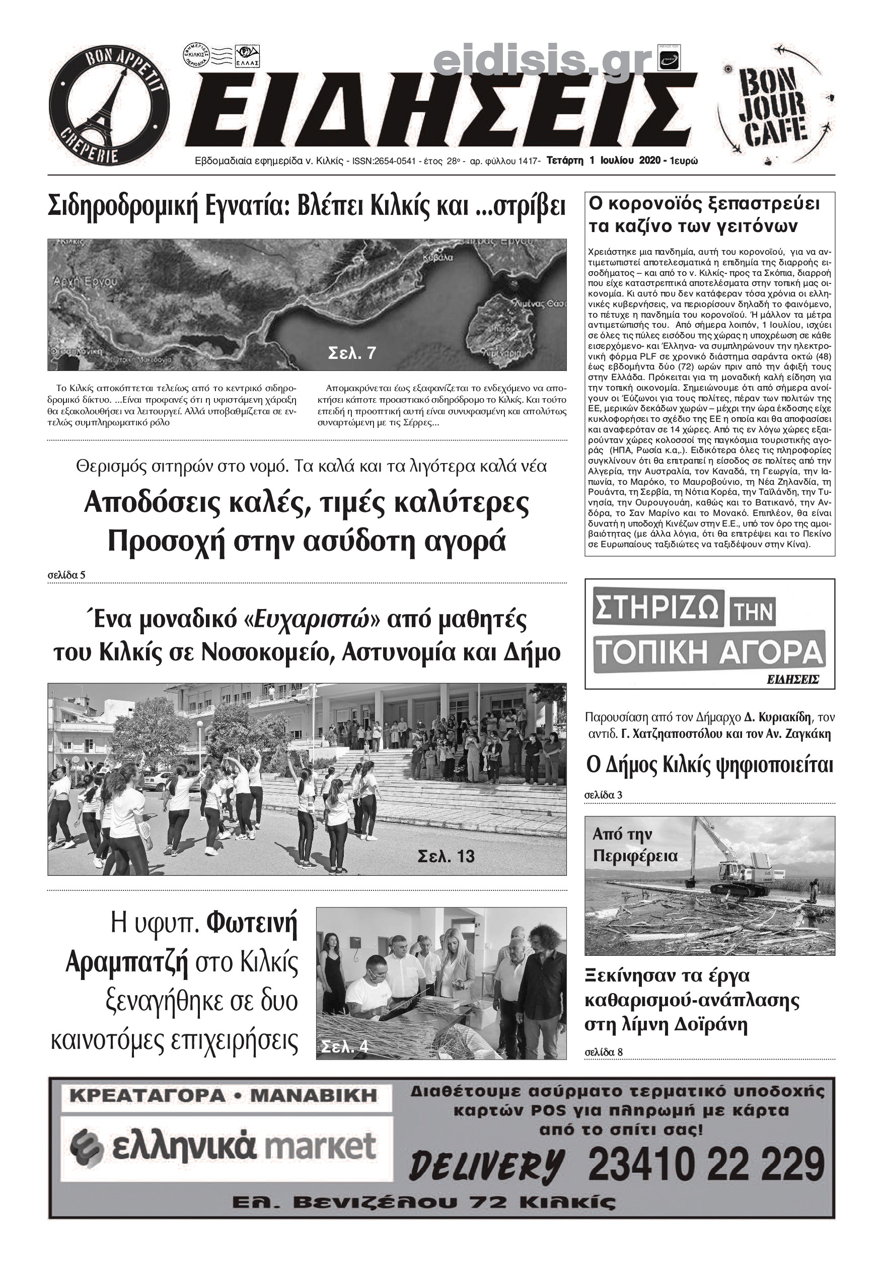 Διαβάστε το νέο πρωτοσέλιδο των ΕΙΔΗΣΕΩΝ του Κιλκίς, της εβδομαδιαίας εφημερίδας του ν. Κιλκίς (1-7-2020)