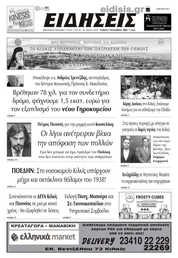Διαβάστε το νέο πρωτοσέλιδο των ΕΙΔΗΣΕΩΝ του Κιλκίς, της εβδομαδιαίας εφημερίδας του ν. Κιλκίς (11-9-2024)