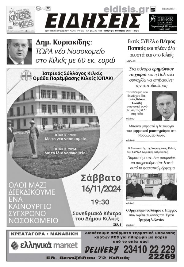 Διαβάστε το νέο πρωτοσέλιδο των ΕΙΔΗΣΕΩΝ του Κιλκίς, της εβδομαδιαίας εφημερίδας του ν. Κιλκίς (13-11-2024)