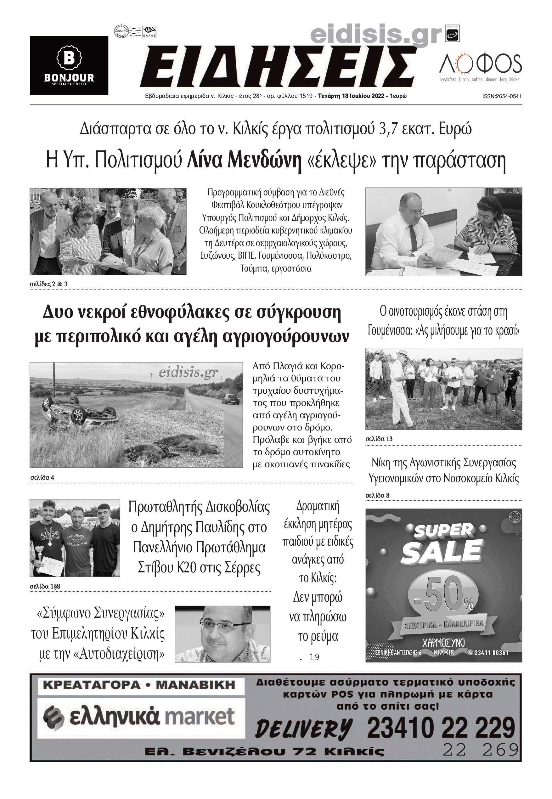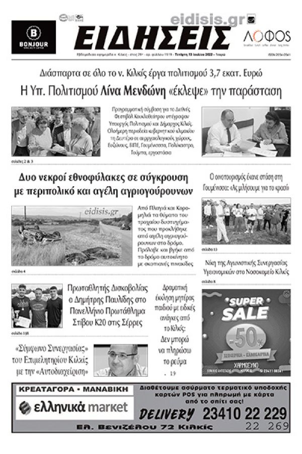 Διαβάστε το νέο πρωτοσέλιδο των ΕΙΔΗΣΕΩΝ του Κιλκίς, της εβδομαδιαίας εφημερίδας του ν. Κιλκίς (13-7-2022)