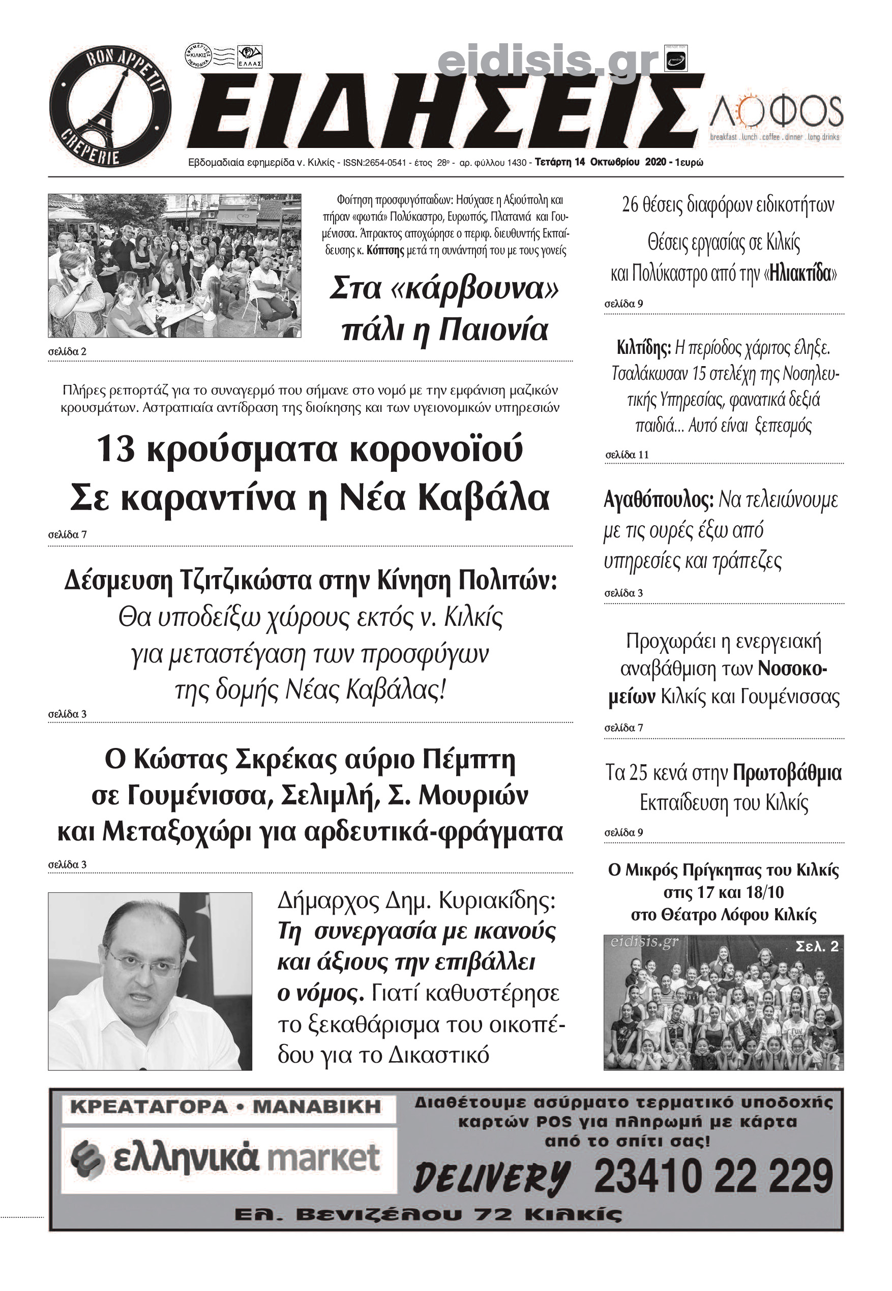 Διαβάστε το νέο πρωτοσέλιδο των ΕΙΔΗΣΕΩΝ του Κιλκίς, της εβδομαδιαίας εφημερίδας του ν. Κιλκίς (14-10-2020)