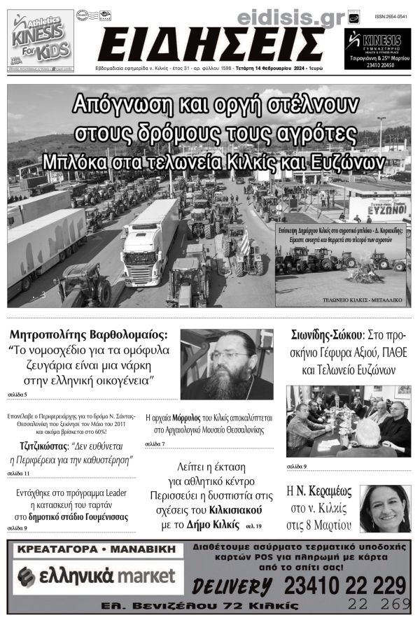 Διαβάστε το νέο πρωτοσέλιδο των ΕΙΔΗΣΕΩΝ του Κιλκίς, της εβδομαδιαίας εφημερίδας του ν. Κιλκίς (14-2-2024)