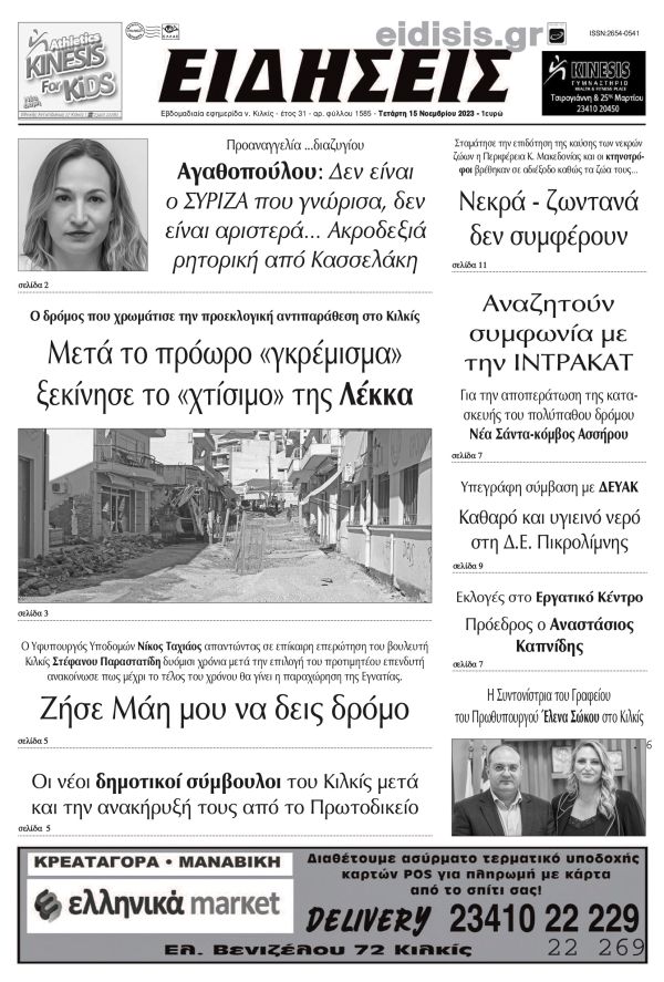 Διαβάστε το νέο πρωτοσέλιδο των ΕΙΔΗΣΕΩΝ του Κιλκίς, της εβδομαδιαίας εφημερίδας του ν. Κιλκίς (15-11-2023)