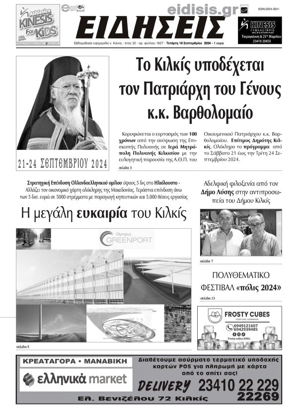 Διαβάστε το νέο πρωτοσέλιδο των ΕΙΔΗΣΕΩΝ του Κιλκίς, της εβδομαδιαίας εφημερίδας του ν. Κιλκίς (18-9-2024)