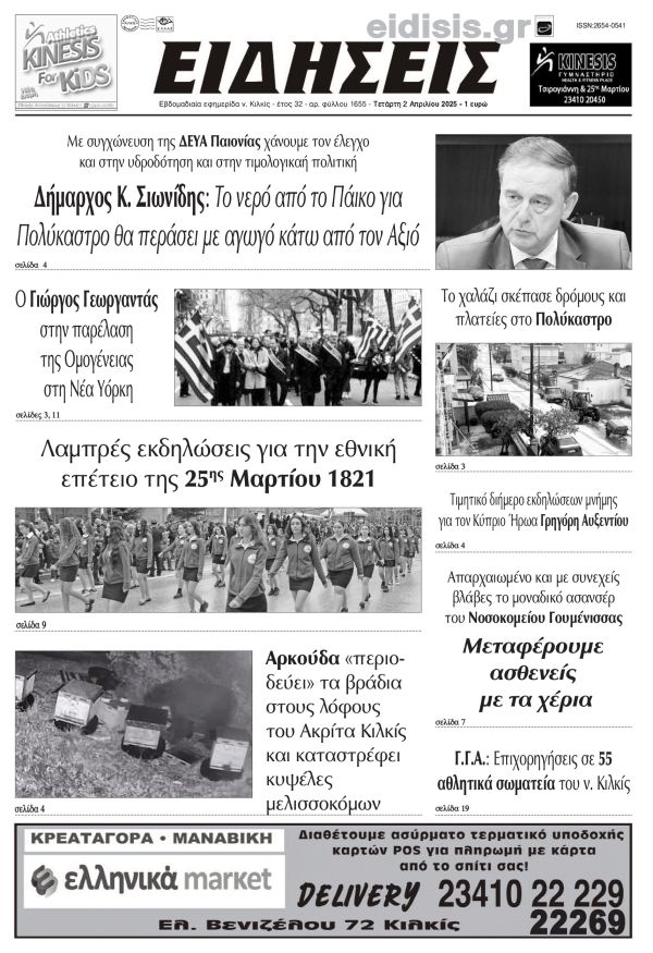 Διαβάστε το νέο πρωτοσέλιδο των ΕΙΔΗΣΕΩΝ του Κιλκίς, της εβδομαδιαίας εφημερίδας του ν. Κιλκίς (2-4-2025)