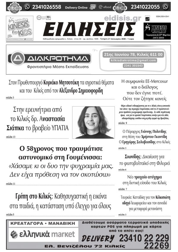 Διαβάστε το νέο πρωτοσέλιδο των ΕΙΔΗΣΕΩΝ του Κιλκίς, της εβδομαδιαίας εφημερίδας του ν. Κιλκίς (21-1-2026)
