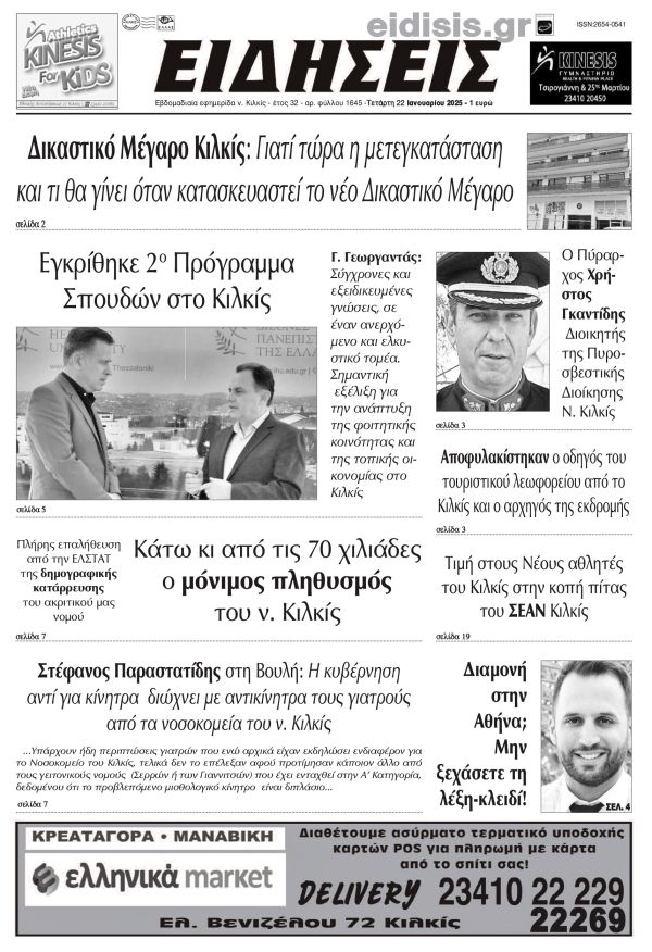 Διαβάστε το νέο πρωτοσέλιδο των ΕΙΔΗΣΕΩΝ του Κιλκίς, της εβδομαδιαίας εφημερίδας του ν. Κιλκίς (22-1-2025)