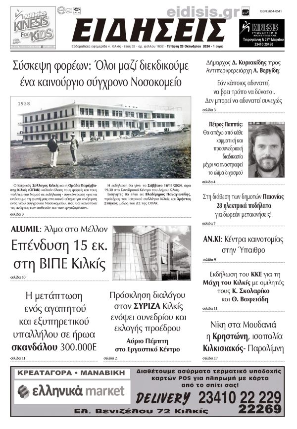 Διαβάστε το νέο πρωτοσέλιδο των ΕΙΔΗΣΕΩΝ του Κιλκίς, της εβδομαδιαίας εφημερίδας του ν. Κιλκίς (23-10-2024)