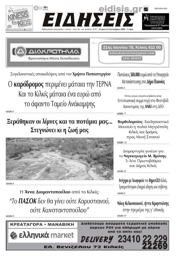 Διαβάστε το νέο πρωτοσέλιδο των ΕΙΔΗΣΕΩΝ του Κιλκίς, της εβδομαδιαίας εφημερίδας του ν. Κιλκίς (24-9-2025)