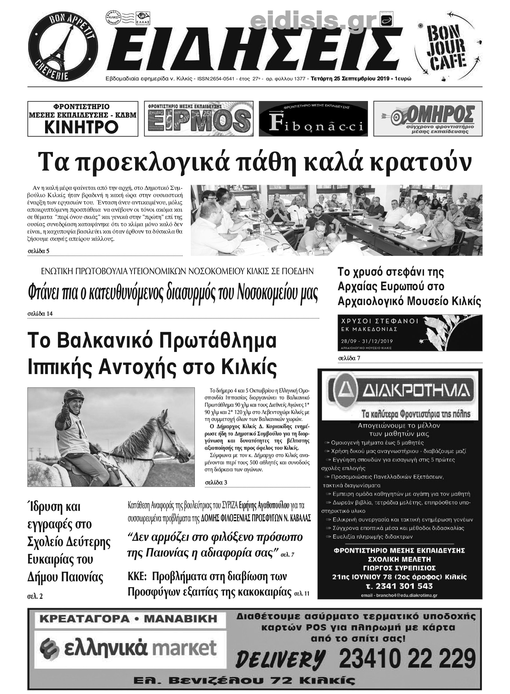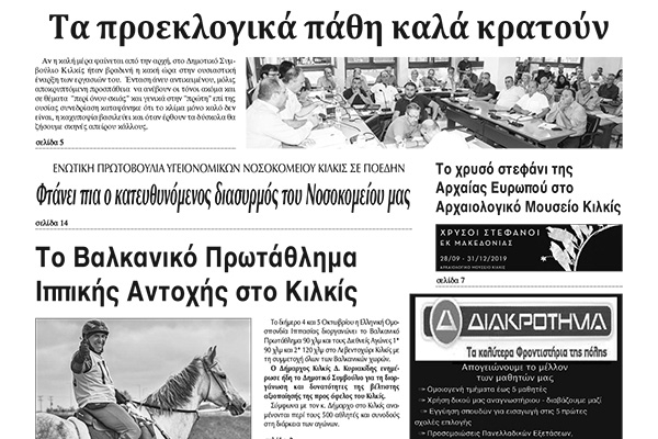 Διαβάστε το νέο πρωτοσέλιδο των ΕΙΔΗΣΕΩΝ του Κιλκίς, της εβδομαδιαίας εφημερίδας του ν. Κιλκίς (25-9-2019)