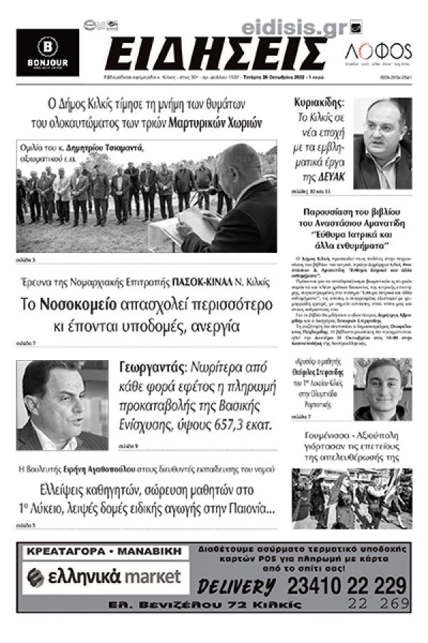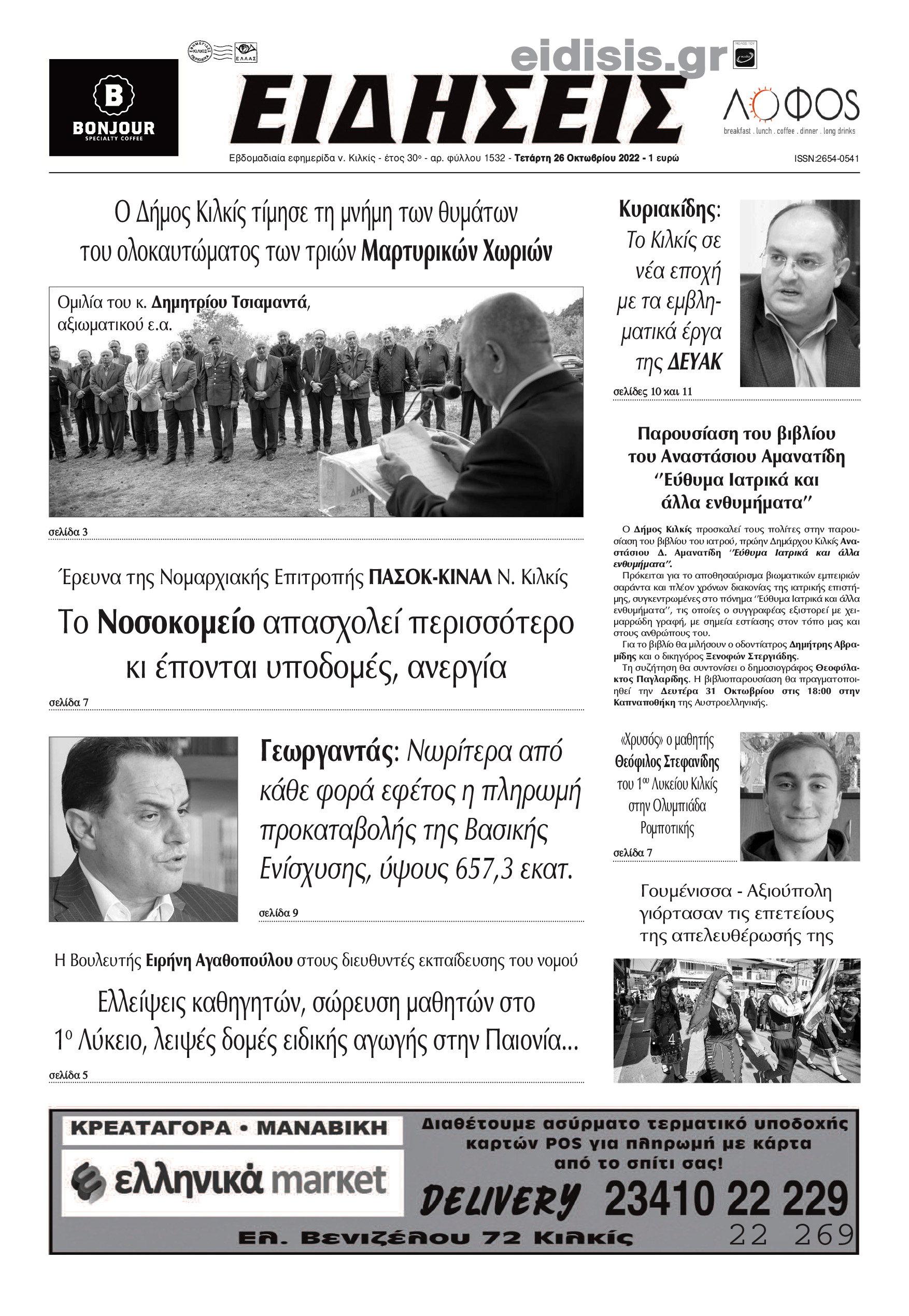 Διαβάστε το νέο πρωτοσέλιδο των ΕΙΔΗΣΕΩΝ του Κιλκίς, της εβδομαδιαίας εφημερίδας του ν. Κιλκίς (26-10-2022)