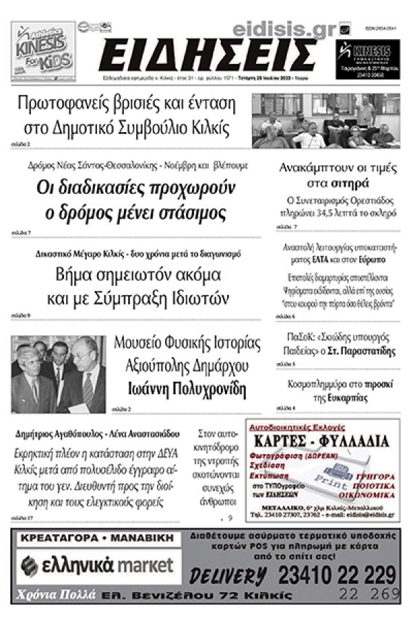 Διαβάστε το νέο πρωτοσέλιδο των ΕΙΔΗΣΕΩΝ του Κιλκίς, της εβδομαδιαίας εφημερίδας του ν. Κιλκίς (26-7-2023)