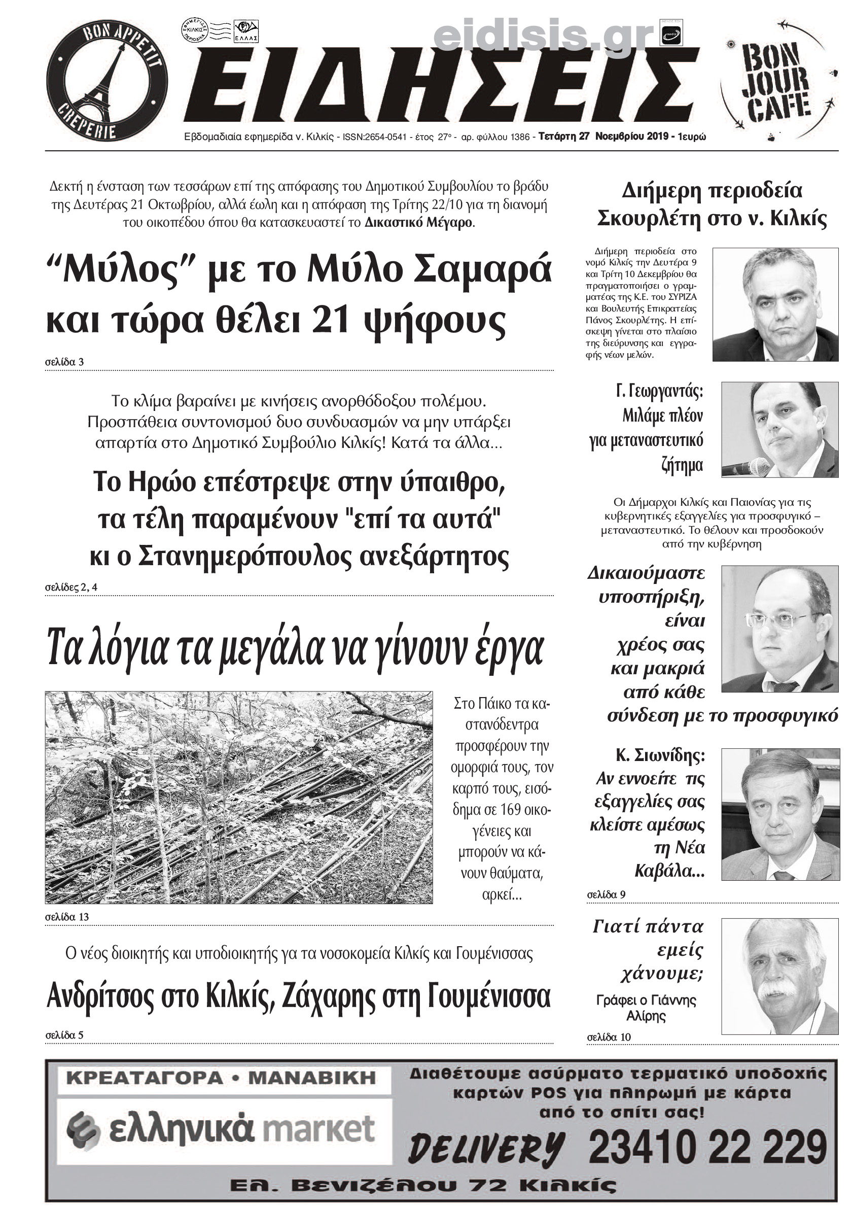 Διαβάστε το νέο πρωτοσέλιδο των ΕΙΔΗΣΕΩΝ του Κιλκίς, της εβδομαδιαίας εφημερίδας του ν. Κιλκίς (27-11-2019)
