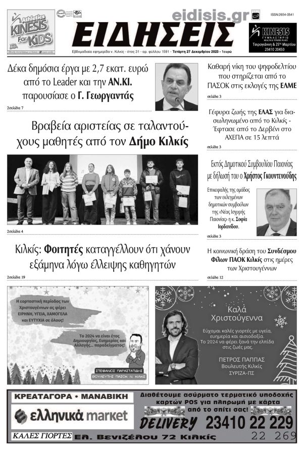 Διαβάστε το νέο πρωτοσέλιδο των ΕΙΔΗΣΕΩΝ του Κιλκίς, της εβδομαδιαίας εφημερίδας του ν. Κιλκίς (27-12-2023)