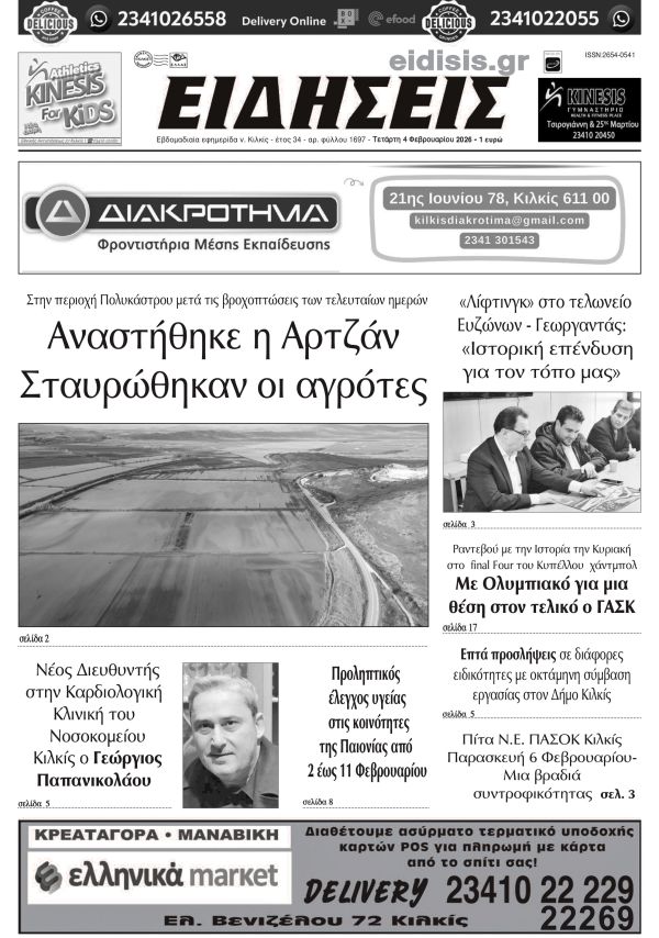 Διαβάστε το νέο πρωτοσέλιδο των ΕΙΔΗΣΕΩΝ του Κιλκίς, της εβδομαδιαίας εφημερίδας του ν. Κιλκίς (4-2-2026)
