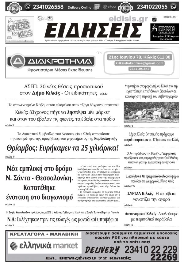 Διαβάστε το νέο πρωτοσέλιδο των ΕΙΔΗΣΕΩΝ του Κιλκίς, της εβδομαδιαίας εφημερίδας του ν. Κιλκίς (5-11-2025)