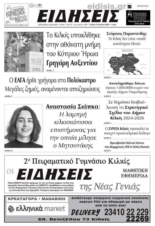 Διαβάστε το νέο πρωτοσέλιδο των ΕΙΔΗΣΕΩΝ του Κιλκίς, της εβδομαδιαίας εφημερίδας του ν. Κιλκίς (9-4-2025)
