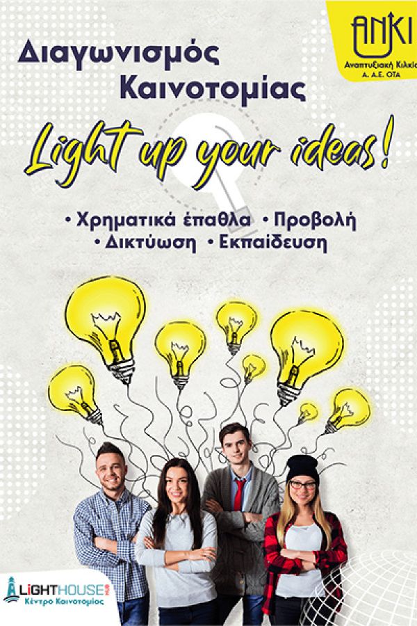 Ο Διαγωνισμός “Light up your ideas!” έχει ως στόχο να αναδείξει, να επιβραβεύσει, να προβάλλει, να προάγει και να βοηθήσει την ανάπτυξη καινοτόμων ιδεών σε τομείς όπως: Αγροδιατροφή, Ευφυής Γεωργία, Τουρισμός, Πολιτισμός, Ενέργεια, Τεχνολογία & ΑΙ, Ρομποτική, Υλικά, Κατασκευές, Εκπαίδευση, Σχεδιασμός & κατασκευή ενδυμάτων κ.ά.