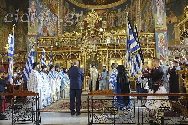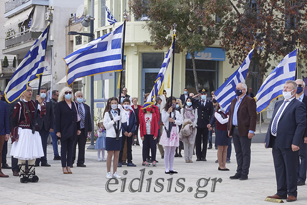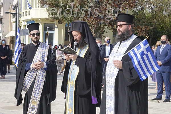 Με το πέρας της δοξολογίας στον αύλειο χώρο της εκκλησίας τα παιδιά της χορωδίας των κατηχητικών της Μητρόπολης τραγούδησαν για το έπος του ’40 και την Μακεδονία, καταχειροκροτούμενα από επισήμους και πολίτες.