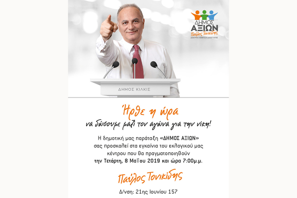 Τα εγκαίνια του εκλογικού κέντρου του υποψήφιου δημάρχου Κιλκίς Παύλου Τονικίδη θα πραγματοποιηθούν την Τετάρτη 8 Μαΐου, στις 7μ.μ. στο Κιλκίς, 21ης Ιουνίου 157.
