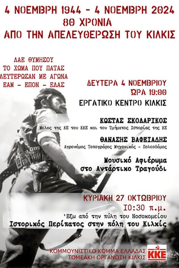 Τη Δευτέρα 4 Νοέμβρη, ανήμερα της επετείου, η ΚΟ διοργανώνει εκδήλωση στις 7μμ στην αίθουσα εκδηλώσεων του Εργατικού Κέντρου Κιλκίς.