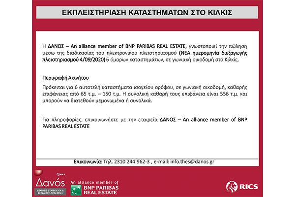 Για πληροφορίες, επικοινωνήστε με την εταιρεία ΔΑΝΟΣ – Αn alliance member of BNP PARIBAS REAL ESTATE, Τηλ. 2310 244962, e-mail: Αυτή η διεύθυνση ηλεκτρονικού ταχυδρομείου προστατεύεται από τους αυτοματισμούς αποστολέων ανεπιθύμητων μηνυμάτων. Χρειάζεται να ενεργοποιήσετε τη JavaScript για να μπορέσετε να τη δείτε.