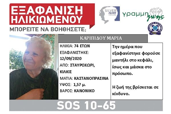 Σύμφωνα με τη “Γραμμή Ζωής”, πρόκειται για την 74χρονη Μαρία Καριπίδου, τα ίχνη της οποίας χάθηκαν χθες από το Σταυροχώρι.