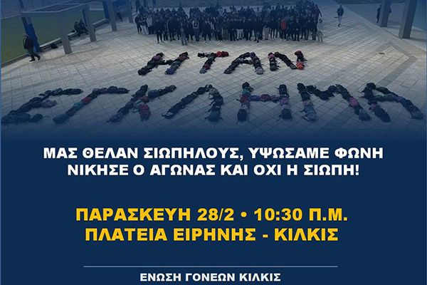 Την Παρασκευή 28 Φεβρουαρίου, στις 10:30 π.μ., στην Πλατεία Ειρήνης, στο Κιλκίς, δυναμώνουμε ακόμα περισσότερο τη φωνή και την απαίτησή μας.