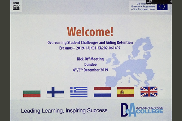 Η εναρκτήρια συνάντηση του προγράμματος πραγματοποιήθηκε την περίοδο 4 – 5 Δεκεμβρίου 2019 στο Νταντί της Σκοτίας και φιλοξενήθηκε από το “DUNDEE AND ANGUS COLLEGE”, ένα κολέγιο με 900 εργαζόμενους και 16.000 σπουδαστές. Στη συνάντηση συμμετείχαν 12 εκπρόσωποι εκπαιδευτικών φορέων – εταίρων από την Ελλάδα (Επιμορφωτική Κιλκίς), τη Σκοτία (Dundee and Angus College), τη Βουλγαρία (Zinev Art Technologies), την Ισπανία (Escuela Profesional Otxarkoaga), την Ολλανδία (ROC Da Vinci College) και τη Φινλανδία (Edupoli Point College Oy). Την Επιμορφωτική Κιλκίς εκπροσώπησαν ο Περικλής Κοσμίδης και η Τατιάνα Ηλιάδου, μέλη της ομάδας Ευρωπαϊκών Προγραμμάτων.