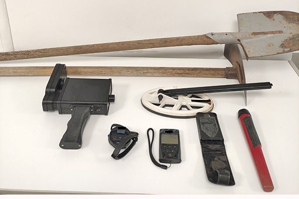 Στην κατοχή τους βρέθηκαν και κατασχέθηκαν ένας ανιχνευτής μετάλλων, μηχάνημα ανίχνευσης υπόγειων νερών, καθώς και δύο σκαπτικά εργαλεία. |