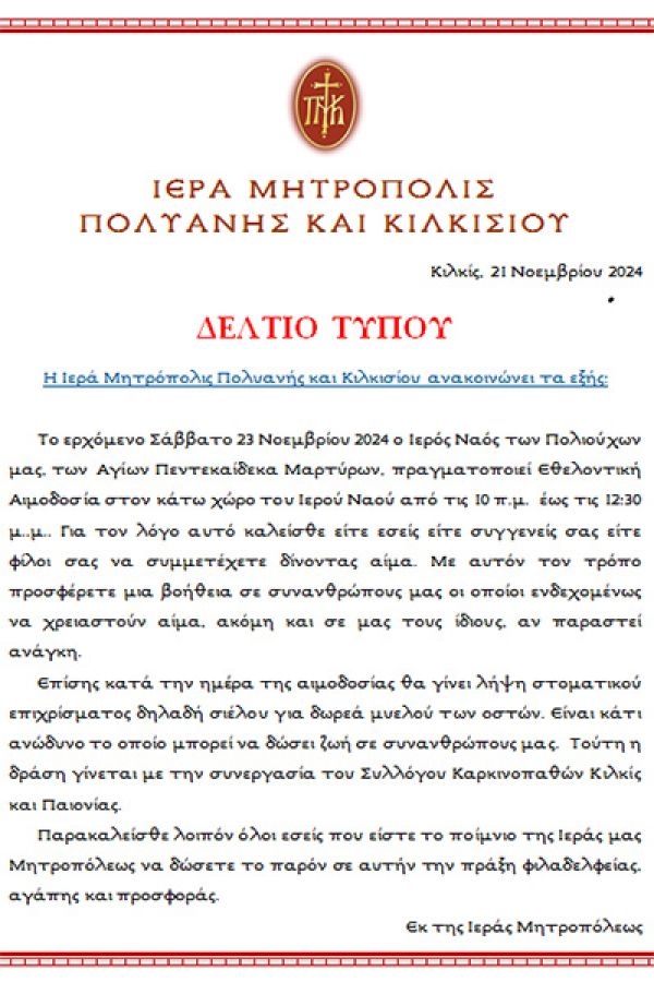 Εθελοντική αιμοδοσία οργανώνει το Σάββατο 23 Νοεμβρίου η Μητρόπολη Πολυανής και Κιλκισίου