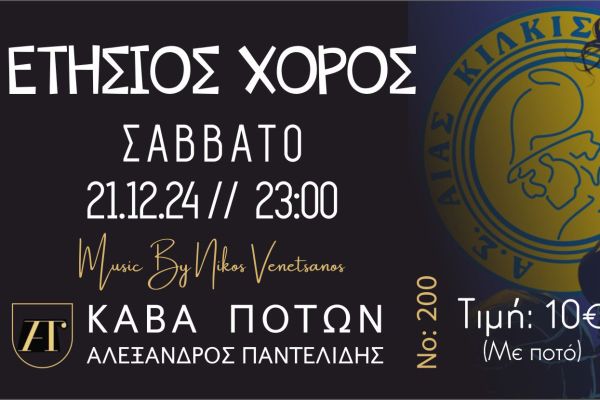Ετήσιος χορός του Αίαντα Κιλκίς στο club Loyal το Σάββατο 21 Δεκεμβρίου 2024