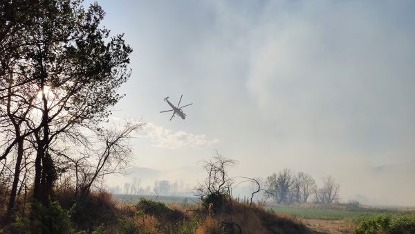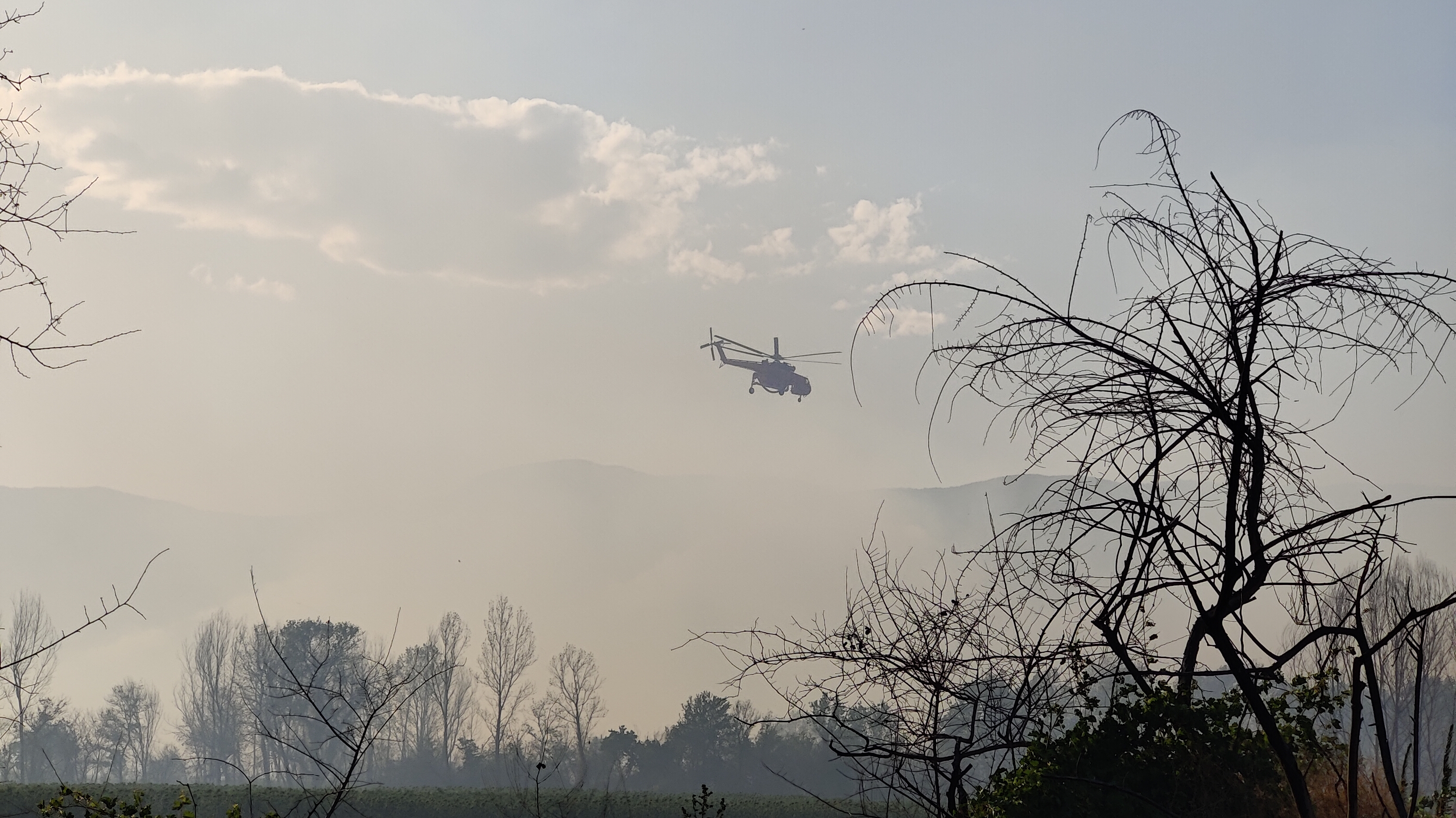 Πρωταγωνιστικό ρόλο διαδραματίζουν πλέον τα ελικόπτερα που παίρνουν νερό από τη γειτονική Δοϊράνη και επιχειρούν ρίψεις νερού για λίγη ώρα ακόμη καθώς αρχίζει να σκοτεινιάζει στις 8.30 μ.μ.
