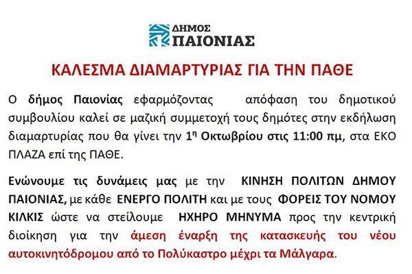 Ο Δήμος με επικεφαλής τον Δήμαρχο Κώστα Σιωνίδη και η Κίνηση Πολιτών οργανώνουν το συλλαλητήριο με ένα μόνο αίτημα: Κατασκευάστε το δρόμο με προδιαγραφές αυτοκινητόδρομου. Ολοκληρώστε την κατά τα άλλα έτοιμη ΠΑΘΕ.