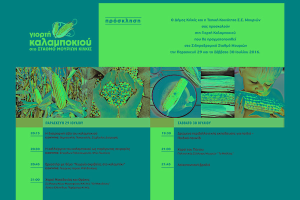 Ο Δήμος Κιλκίς και η Τοπική Κοινότητα Μουριών προσεγγίζουν το χρυσάφι του εύφορου κάμπου, το καλαμπόκι, που είναι το αγαπημένο έδεσμα του καλοκαιριού, και διοργανώνουν Γιορτή Καλαμποκιού με την προσδοκία να αναδείξουν την αγροτική τοπική παραγωγή, την υψηλή διατροφική αξία του προϊόντος, τη γευσιγνωσία αλλά και τα συγκριτικά πλεονεκτήματα της περιοχής.