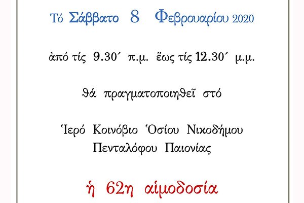 Η 62η Αιμοδοσία του Ιερού Κοινόβιου Οσίου Νικοδήμου Πενταλόφου το Σάββατο 8/2/2020