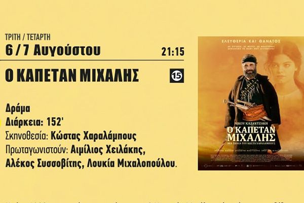 Η ταινία "Ο Καπετάν Μιχάλης" προβάλλεται στον Δημοτικό Θερινό Κινηματογράφο Κιλκίς την Τρίτη 6 και την Τετάρτη 7 Αυγούστου 2024.