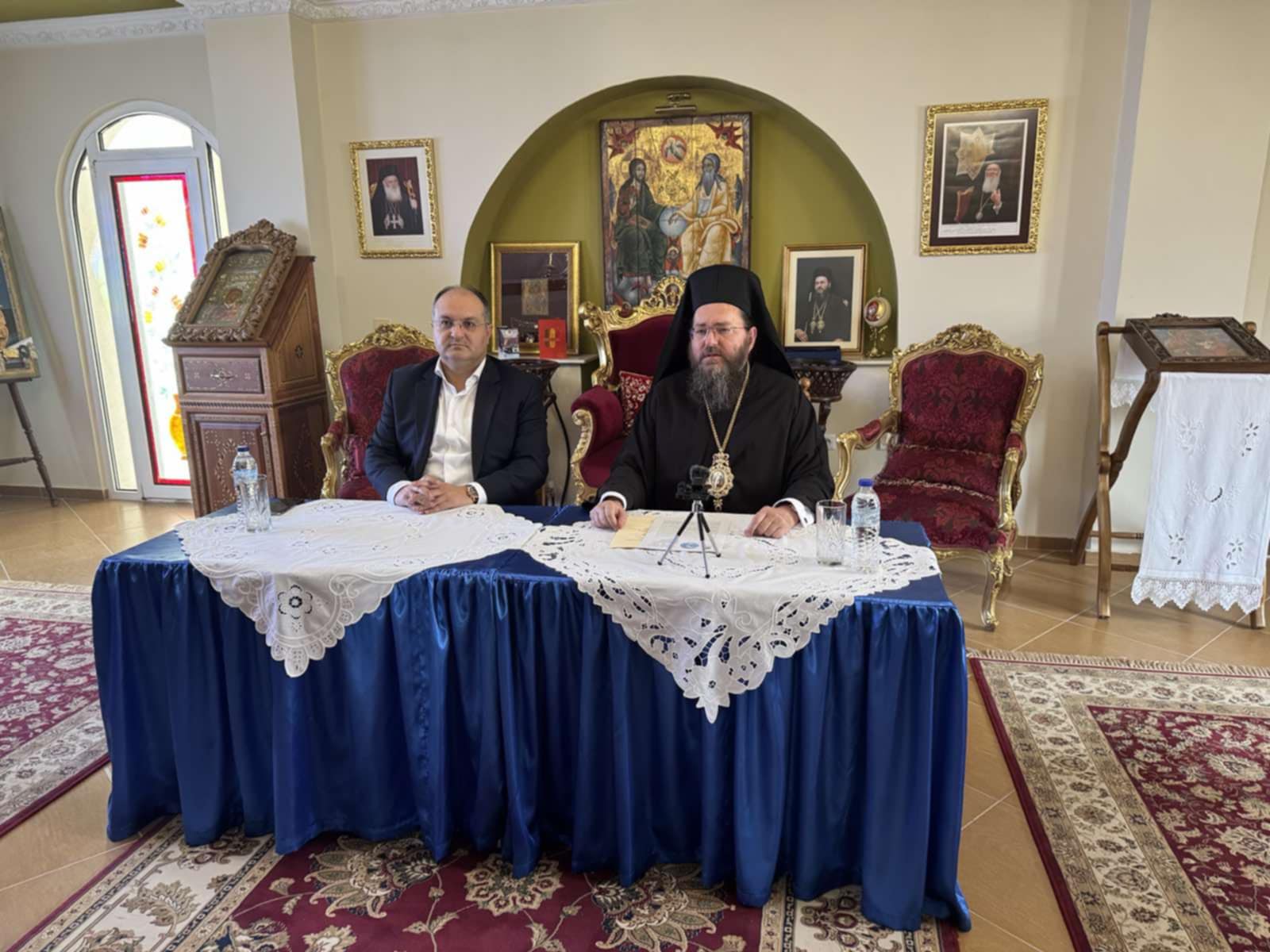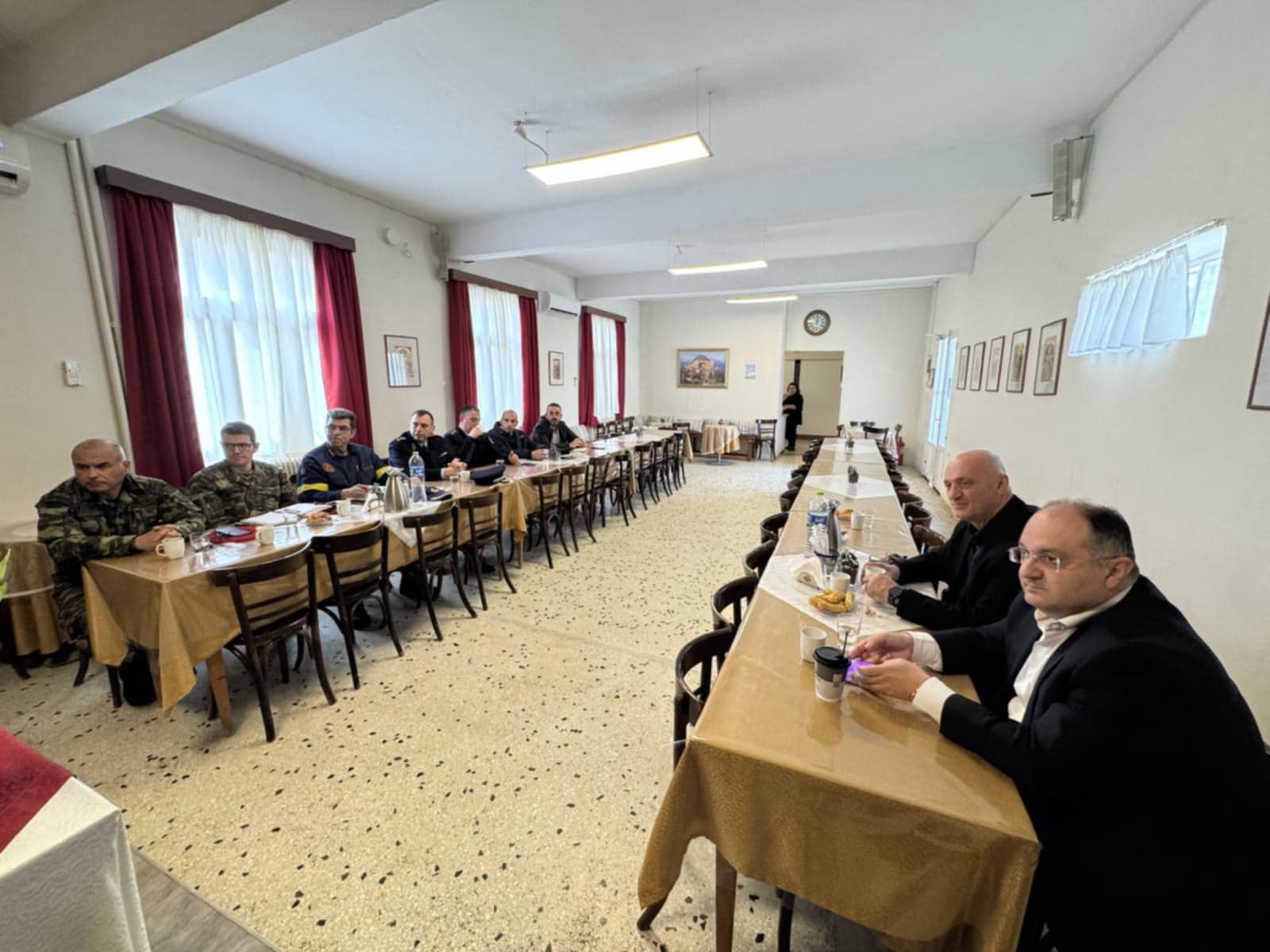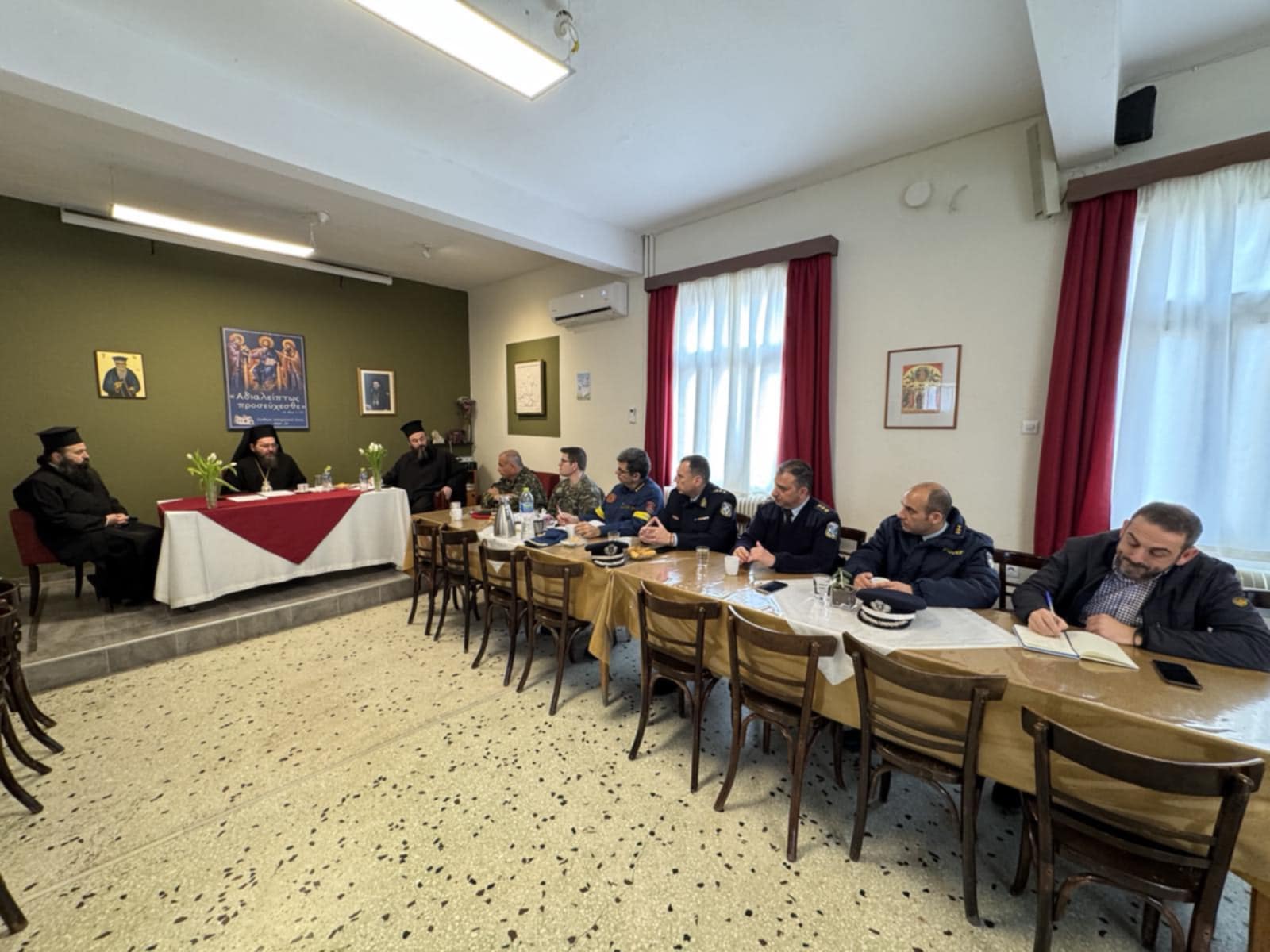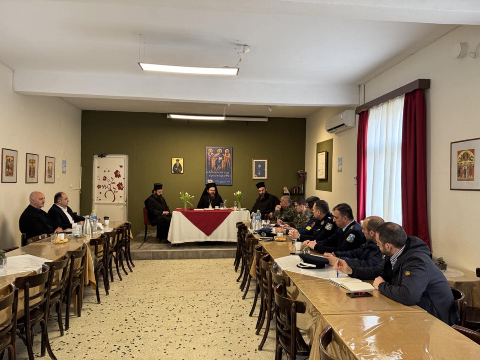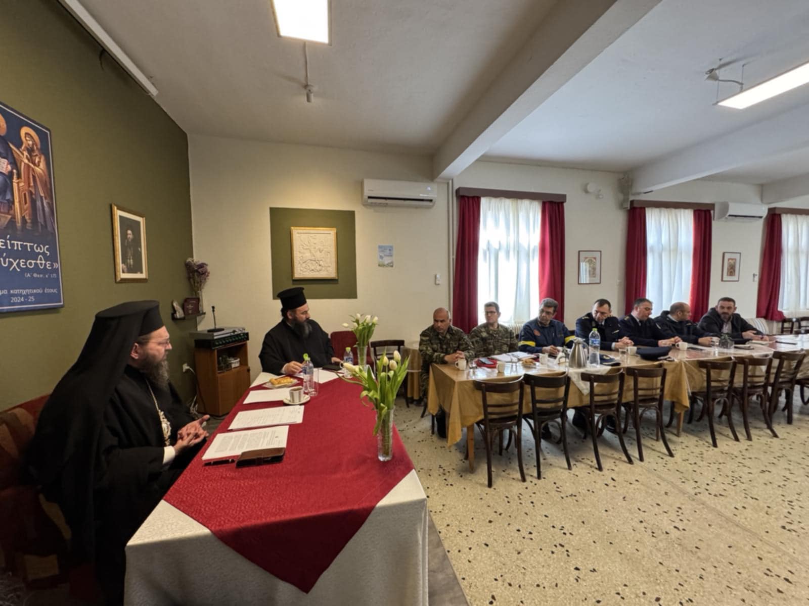 Ακολούθησε σύσκεψη υπό την προεδρία του Σεβασμιωτάτου και με τη συμμετοχή του Δημάρχου, του Αντιπεριφερειάρχη Π.Ε. Κιλκίς κ. Ανδρέα Βεργίδη και εκπροσώπων του Στρατού, της Αστυνομίας και της Πυροσβεστικής στην Εστία του Μητροπολιτικού Ναού, όπου συζητήθηκαν λεπτομέρειες επί του προγράμματος, καθώς και θέματα σχετικά με την καλύτερη δυνατή προετοιμασία της υποδοχής της Τιμίας Ζώνης στην ακριτική Ιερά Μητρόπολη Πολυανής και Κιλκισίου.
