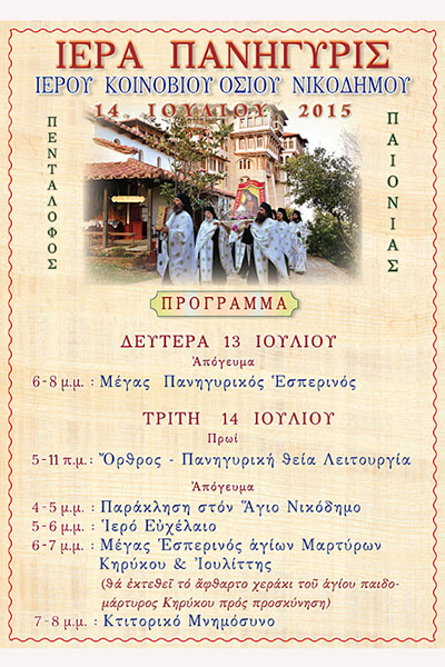 Ιερά Πανήγυρις στο Ιερό Κοινόβιου Οσίου Νικοδήμου στον Πεντάλοφο Γουμένισσας, τη Δευτέρα 13 και την Τρίτη 14 Ιουλίου.